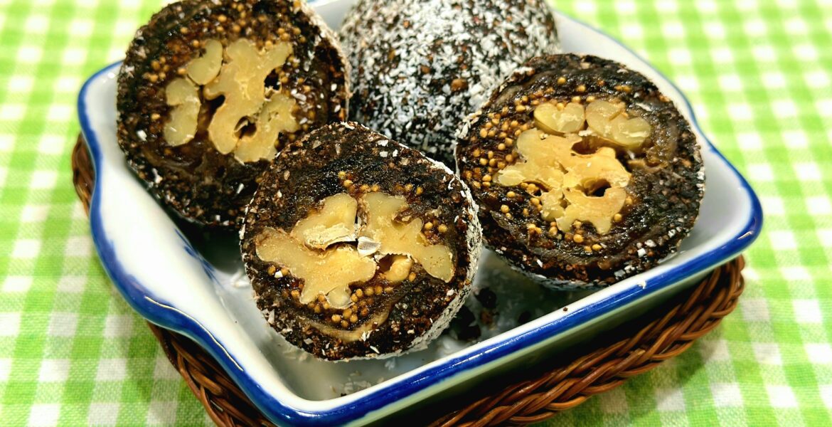 8. Aynı işlemi bütün incirlere uyguladıktan sonra hazırlanan incirli cevizli sarmalar 15-20 dakika buzdolabında dinlendirilir.