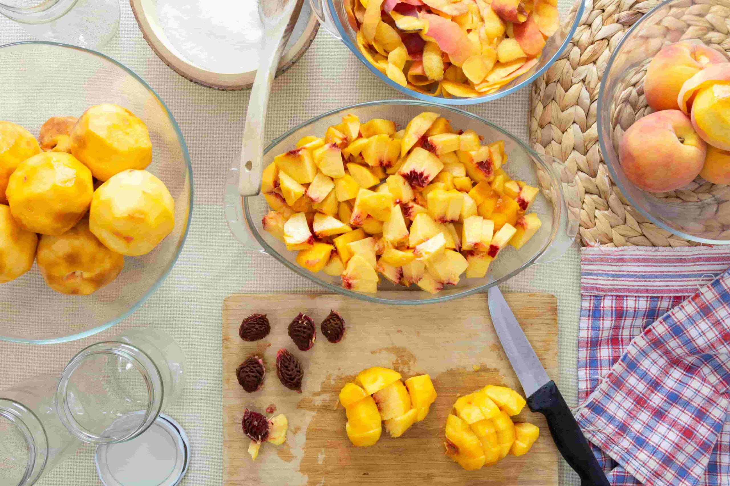 1. Şeftalilerin kabukları soyulur. Arzuya göre dilimlenir ya da küp şeklinde doğranır ve kavanozlara doldurulur.