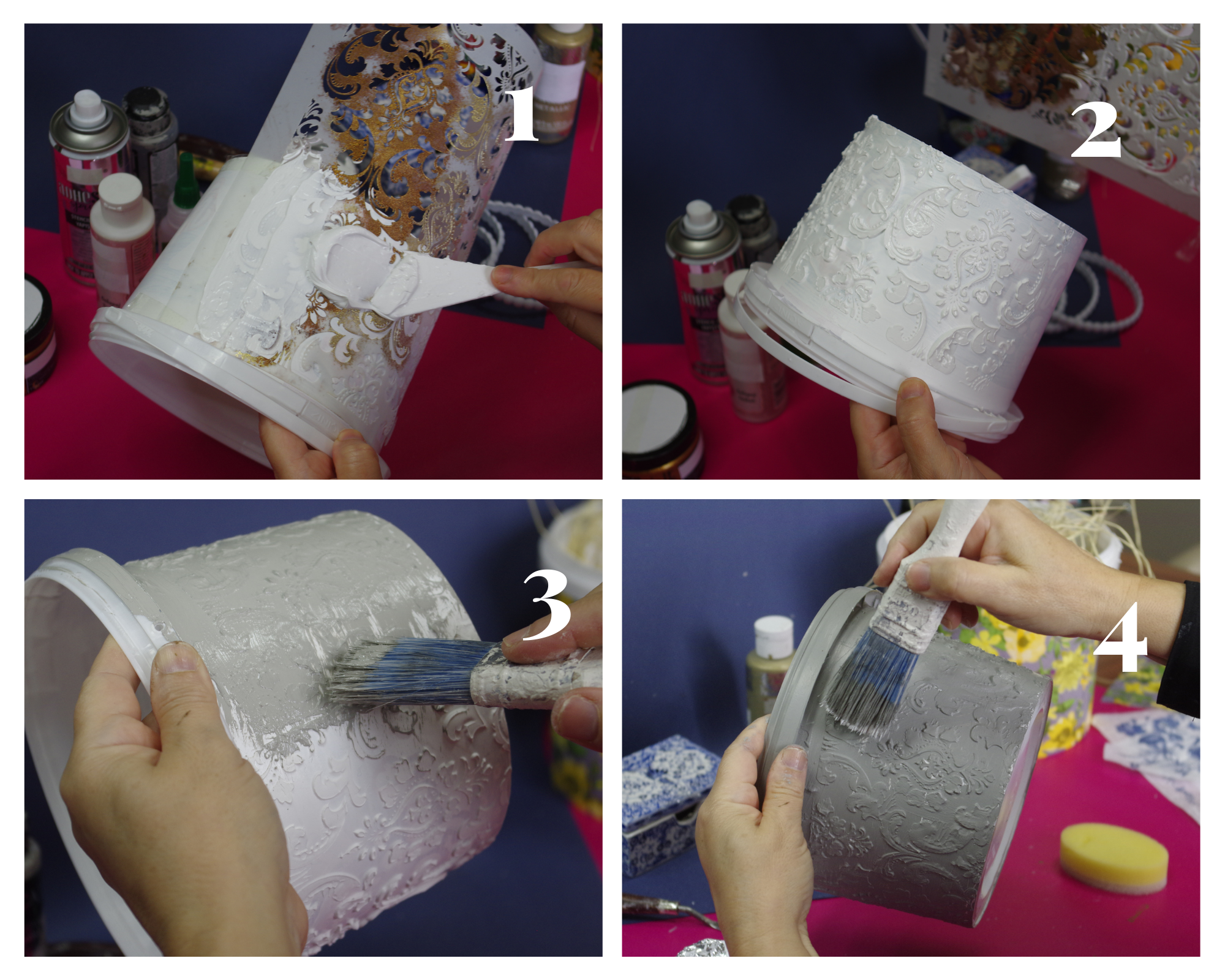 - İki kat boyanan kabın üzerine stencil yapıştırıcı sıkılır ve stencil yapıştırılır.